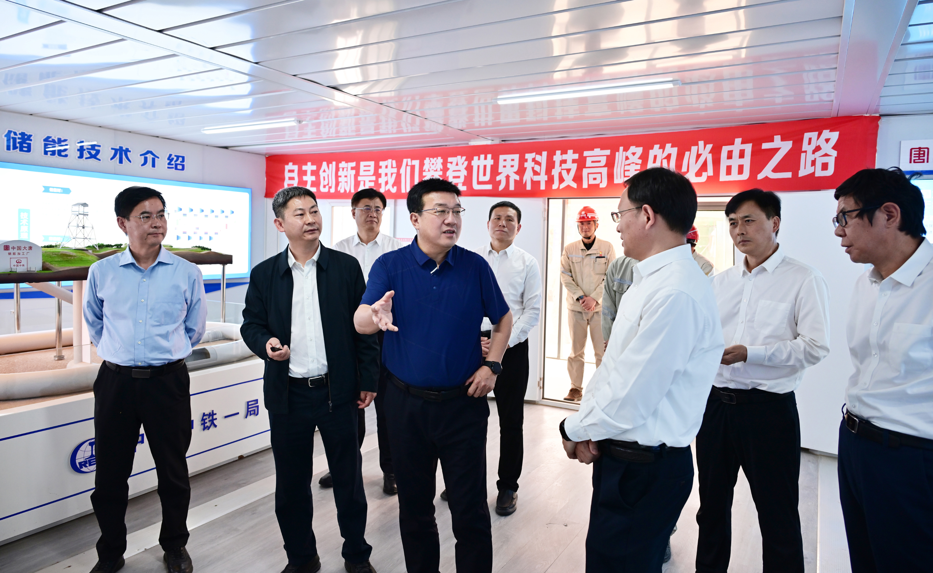 呂軍一行首先來到大唐寧夏中寧國際首套百兆瓦級全人工地下儲氣庫壓縮空氣儲能項目建設現場,深入項目主廠房、信息化調度中心以及地下儲氣庫硐口,聽取項目介紹,詳細了解壓縮空氣儲能技術、施工進度、技術創新等情況。