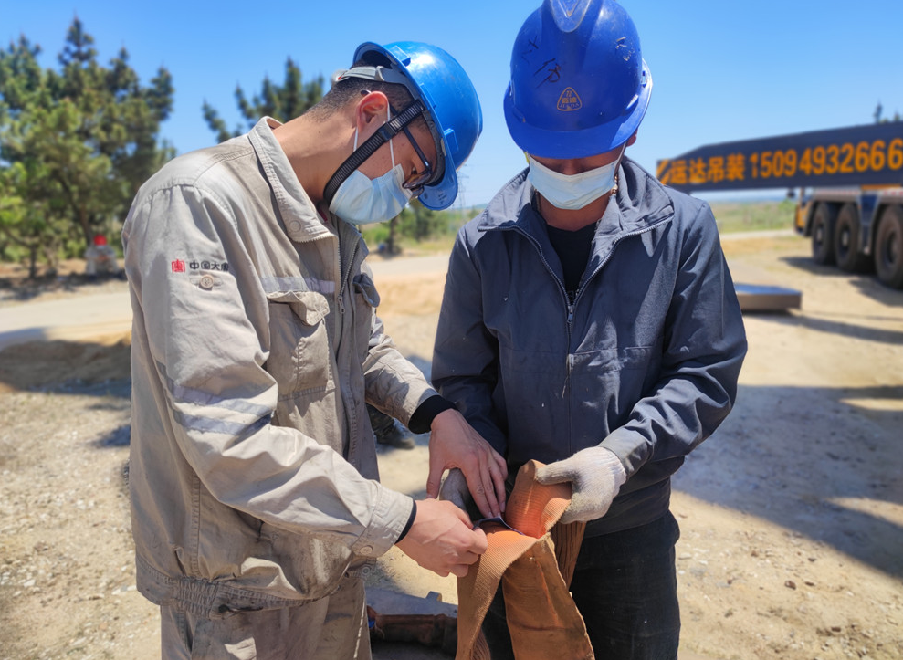 萊州一期技改現場,監察人員在吊裝前對吊帶進行安全檢查(劉思洋/攝)