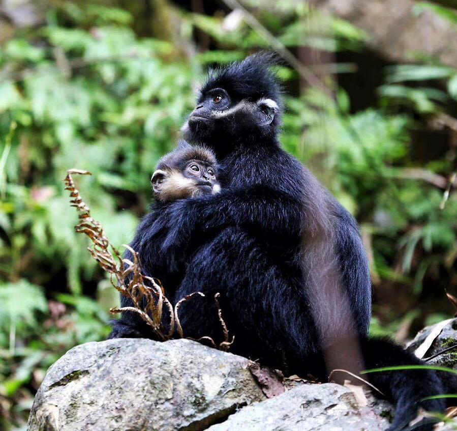 經過長途奔波,快艇行駛到貴州省沿河縣境內的“麻陽河國家級自然保護區”。山上傳來各種表達不同“情緒”的叫聲,在生態環保專業崗位奮斗8年之久的饒振祺朝密林中一指:“快看,那就是黑葉猴!發出‘嘎,嘎’的叫聲,說明它們處在愉快的覓食狀態中;‘噢、噢’就是它們在山林間攀援前進的信號?!碧а弁?,巖石間、樹蔭深處不斷有黑葉猴迅捷地跳躍。它們頭頂冠毛蓬松,通體黑色,兩頰雪白的“絡腮胡”格外醒目,看起來像銀須飄飄的“小老頭”。有的黑葉猴懷里還抱著“金寶寶”——幼猴毛色金黃,隨年齡增大變黑。