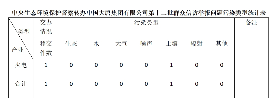 2025年6月16日,中央第七生態環境保護督察組向中國大唐集團有限公司移交第十二批群眾信訪舉報件,共計1件,為來信舉報,涉及土壤問題1個。所有舉報件辦理工作已第一時間進入調查核實辦理程序,辦理情況將按照相關要求反饋督察組,并及時向社會公開。